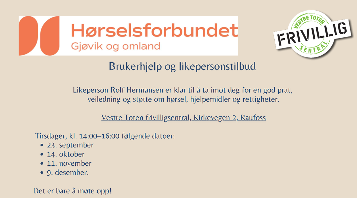 Hørselsforbundet Gjøvik og omland starter opp med brukerhjelp og likepersonstilbud i Vestre Toten kommune. Likeperson Rolf Hermansen er klar til å ta imot deg for en god prat, veiledning og støtte om hørsel, hjelpemidler og rettigheter.